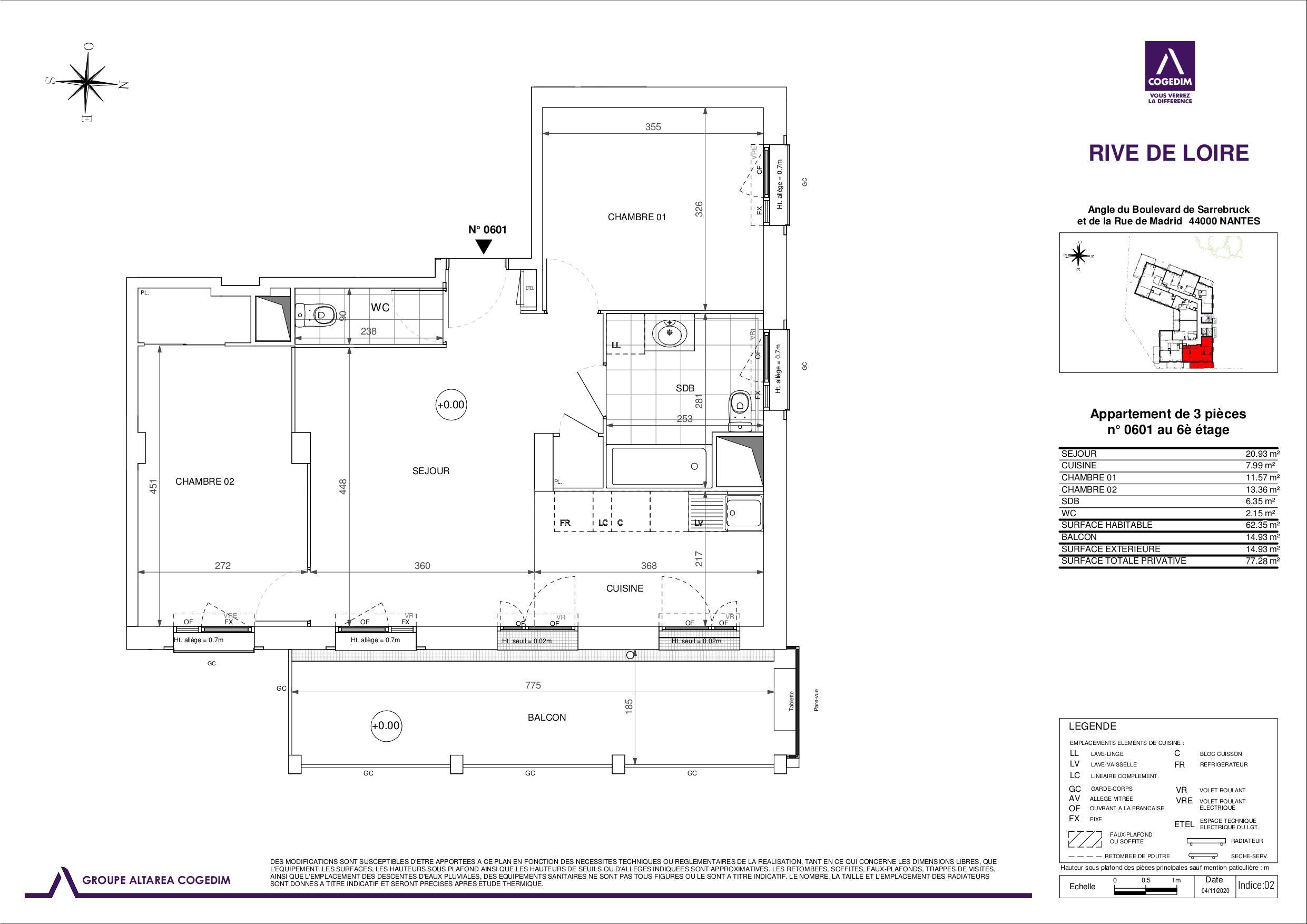 TRES BEAU T3 de 62,35m² au 6e étage d'une résidence récente avec ascenseur comprenant une cuisine équipée ouverte sur le séjour, 2 chambres, 1 salle de bain avec WC, des wc séparés, ainsi qu'un balcon.