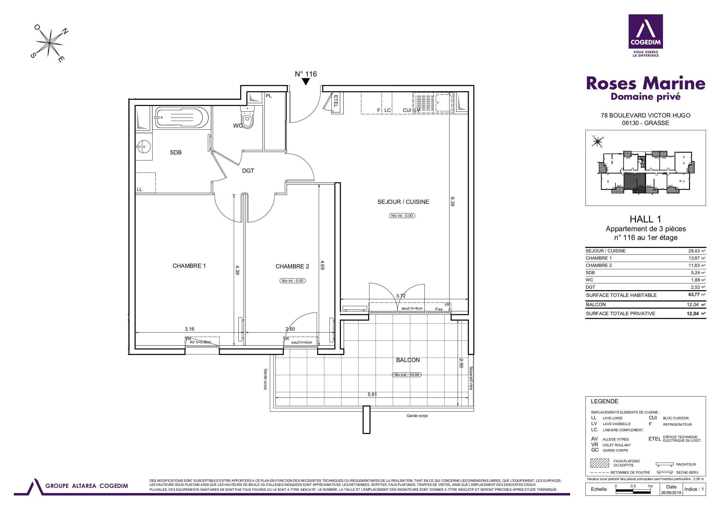 GRASSE- BD VICTOR HUGO : Dans résidence récente de standing, proches des commerces et de toute commodités, beau trois pièces composé d'une cuisine ouverte aménagée, d'un séjour donnant sur balcon de 12,04 m2, deux chambres, une salle de bains, un wc séparé.