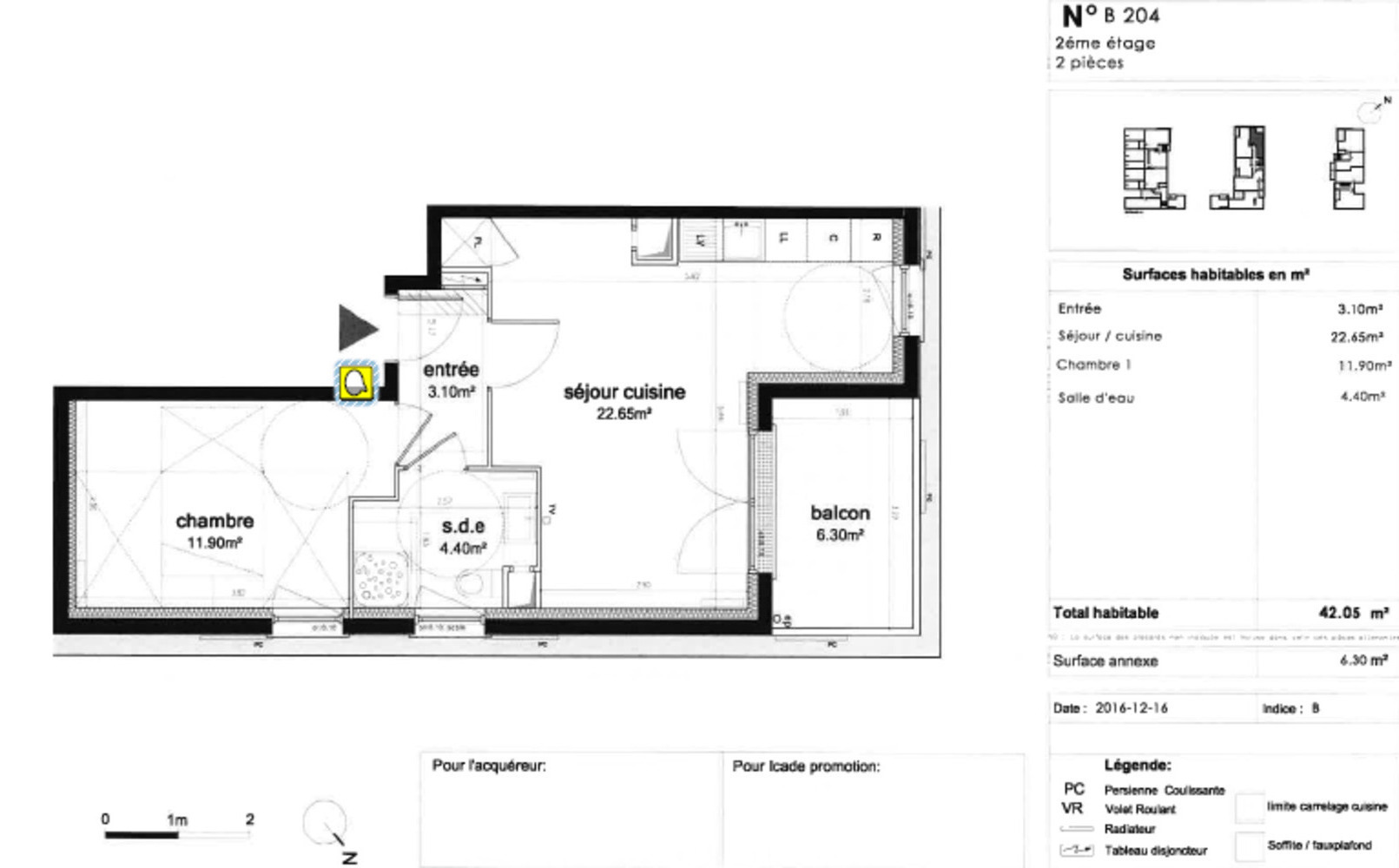 Brétigny sur Orge, à 8 min à pied du RER C. A proximité des écoles, parcs et des commerces. Dans une résidence récente (2019) au deuxième étage avec ascenseur un appartement de type 2 pièces (B204) de 42.05m². Il se compose d'une entrée avec placard, d'un séjour avec une cuisine ouverte, une chambre, une salle d'eau avec W.C et un balcon 6.30m².