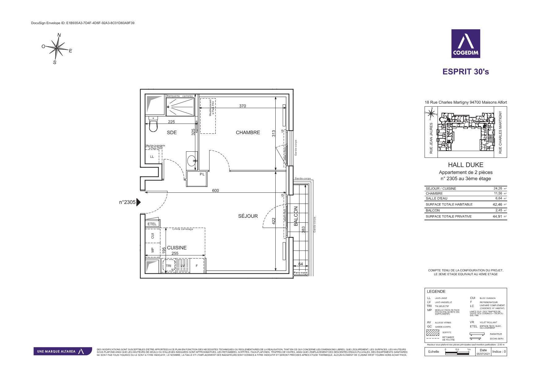 Un appartement de type T2 (2305) d'une surface de 42,46 m2 au 3me étage avec ascenseur, il est composé: