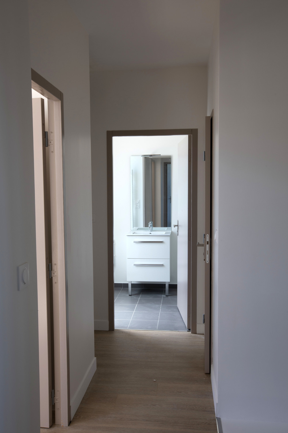 Un dégagement avec placard desservant un wc avec lave-mains.