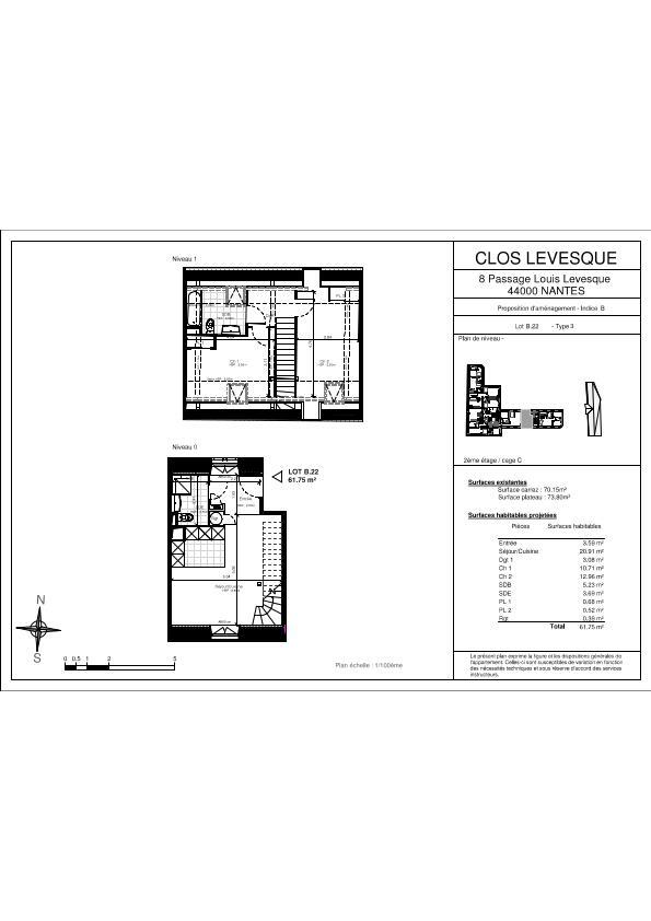 Quartier MONSELET - VIARME - B22 : T3 Duplex d'exception de 60.42m²  au deuxième étage comprenant séjour et cuisine aménagée/équipée, une salle de bain, une salle d'eau, deux WC, ainsi que 2 chambres avec placard