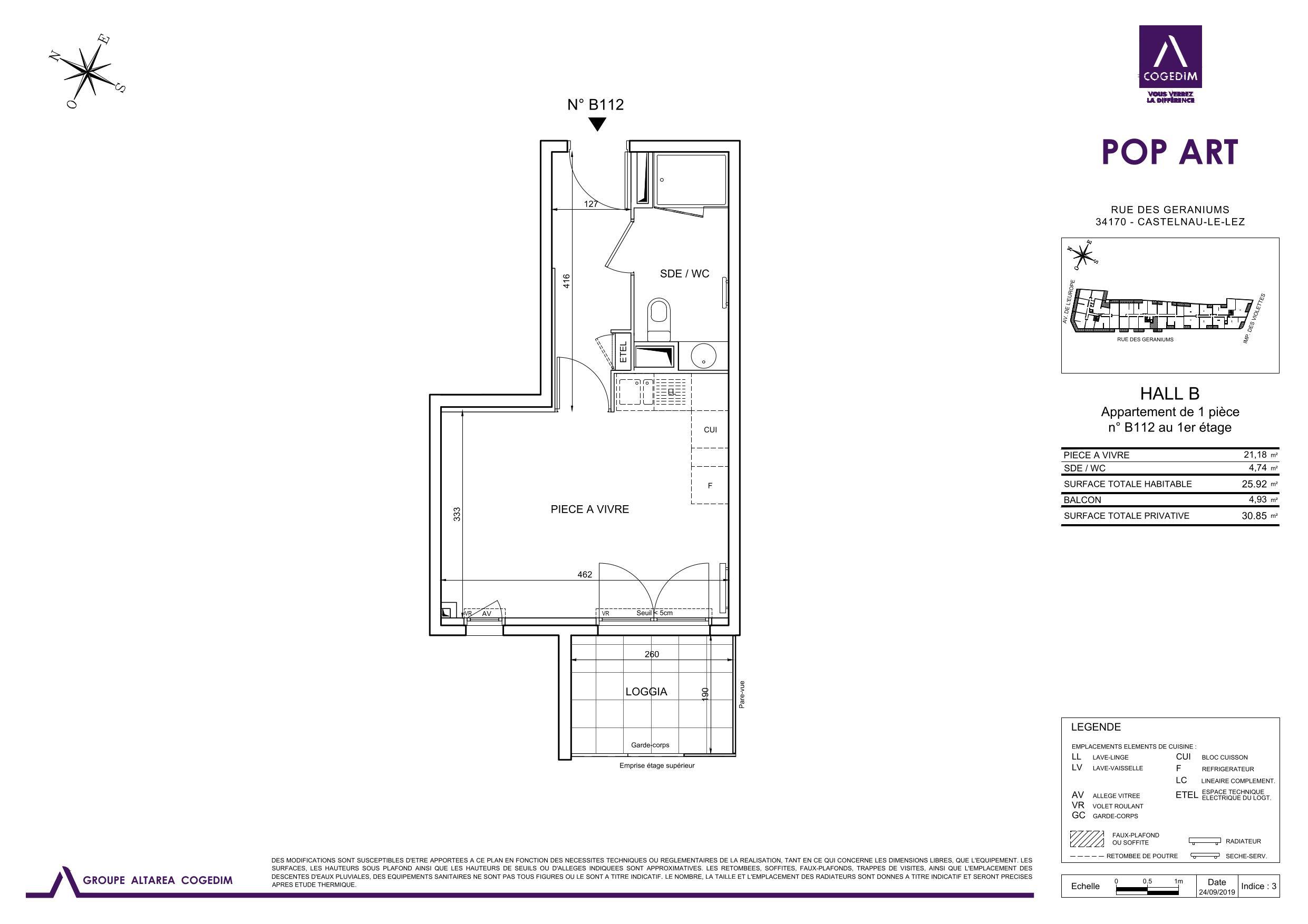 Castelnau-le-Lez, studio récent de 25.92 m² avec terrasse de 4.93 m².