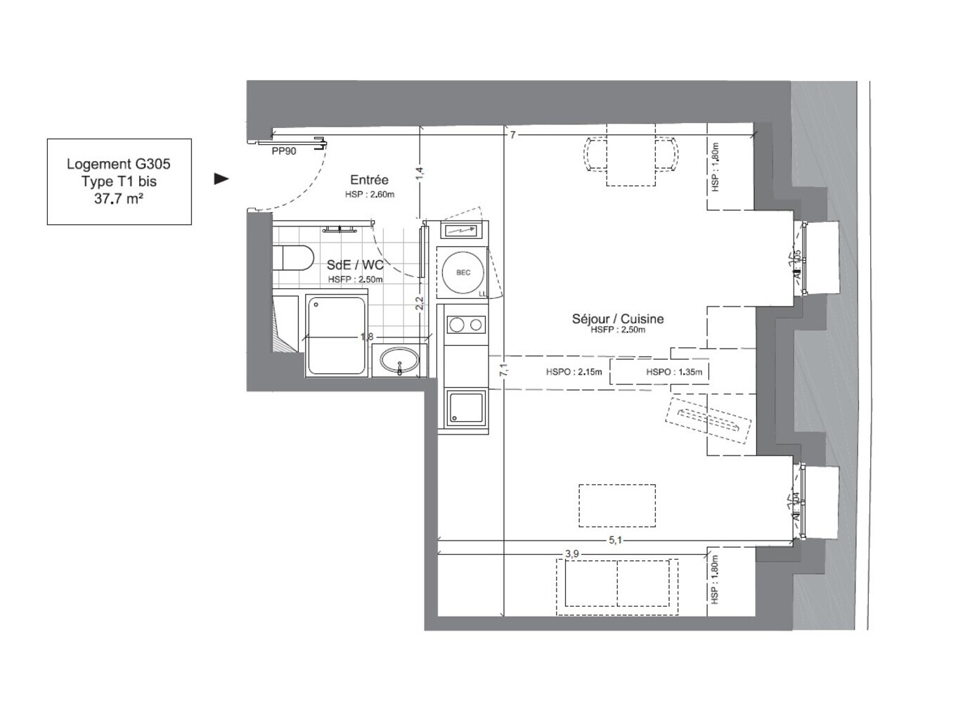 Un appartement de type T1 bis (G-305) d'une surface de 37,70m² situé au 3éme étage.