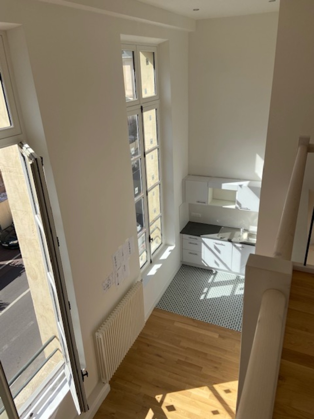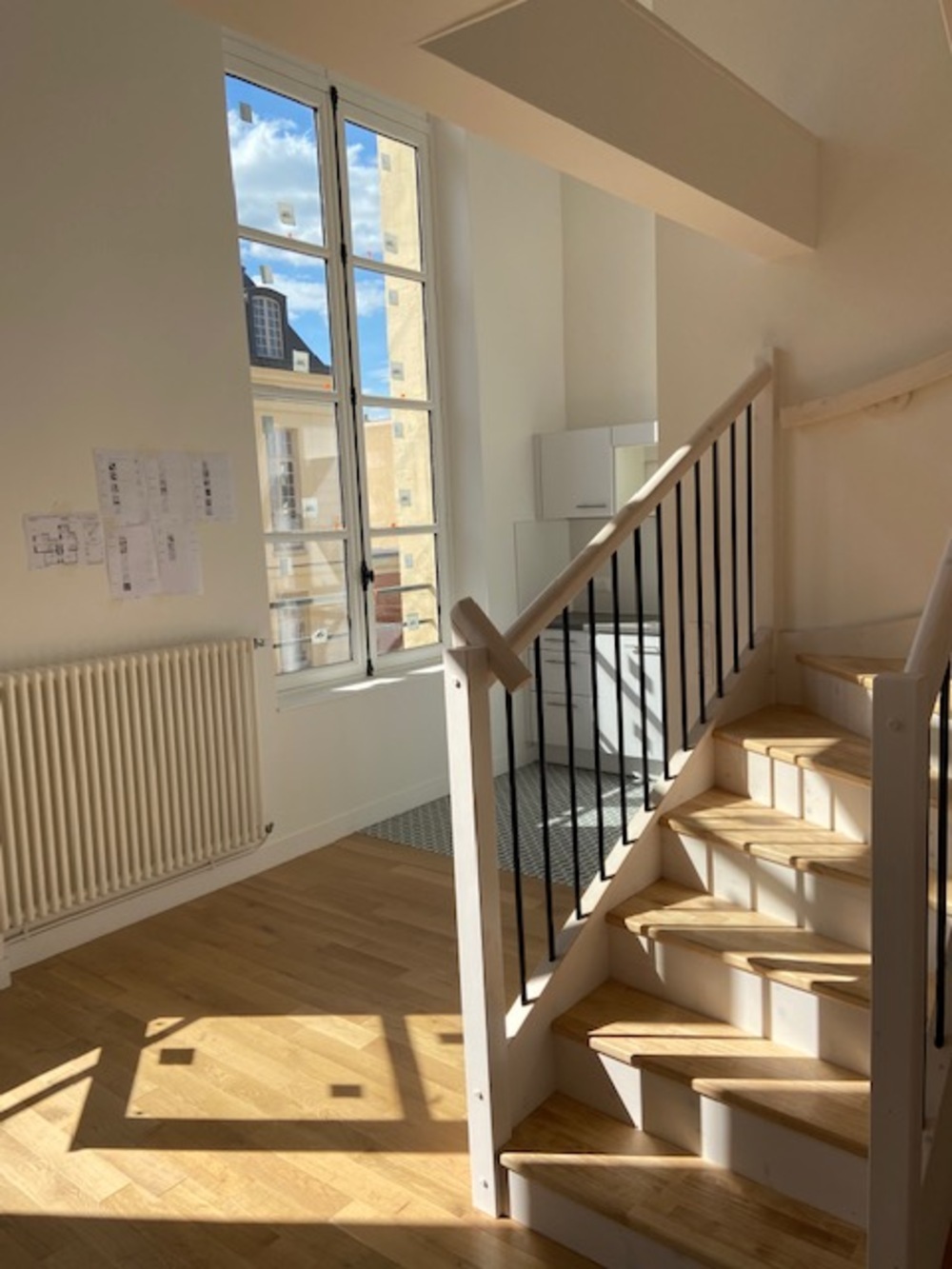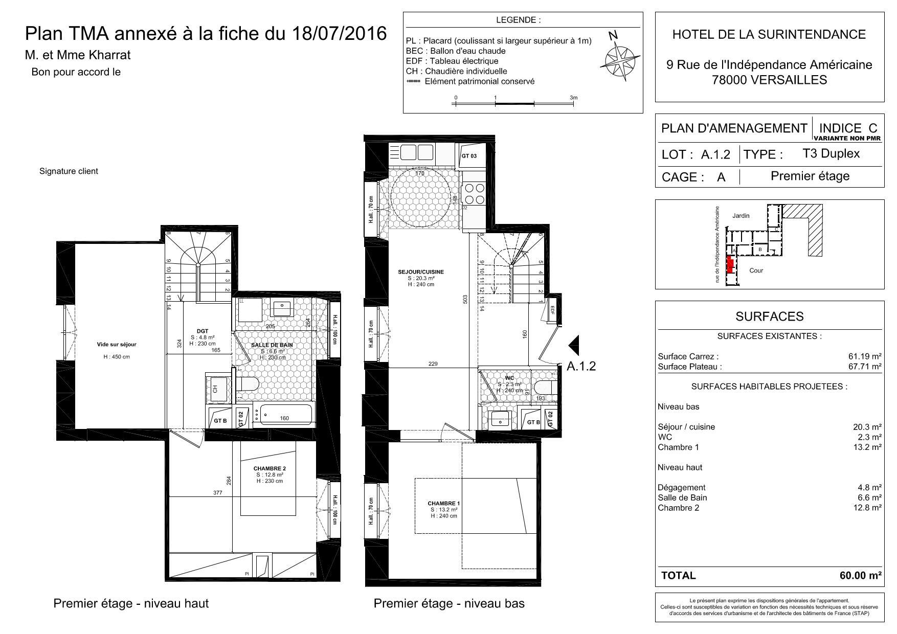 Vous y trouverez un appartement de 3 pièces de 61.19m² (A12) en duplex situé au 1er étage, comprenant: une entrée, un séjour avec cuisine ouverte aménagée et équipée en plaques, four, hotte, deux chambres, une salle de bain avec WC et un WC séparé.