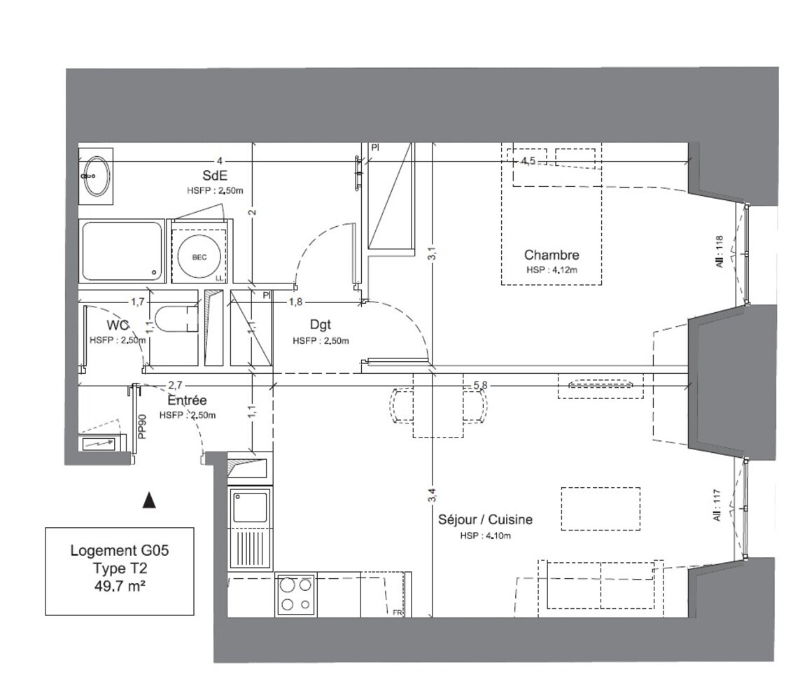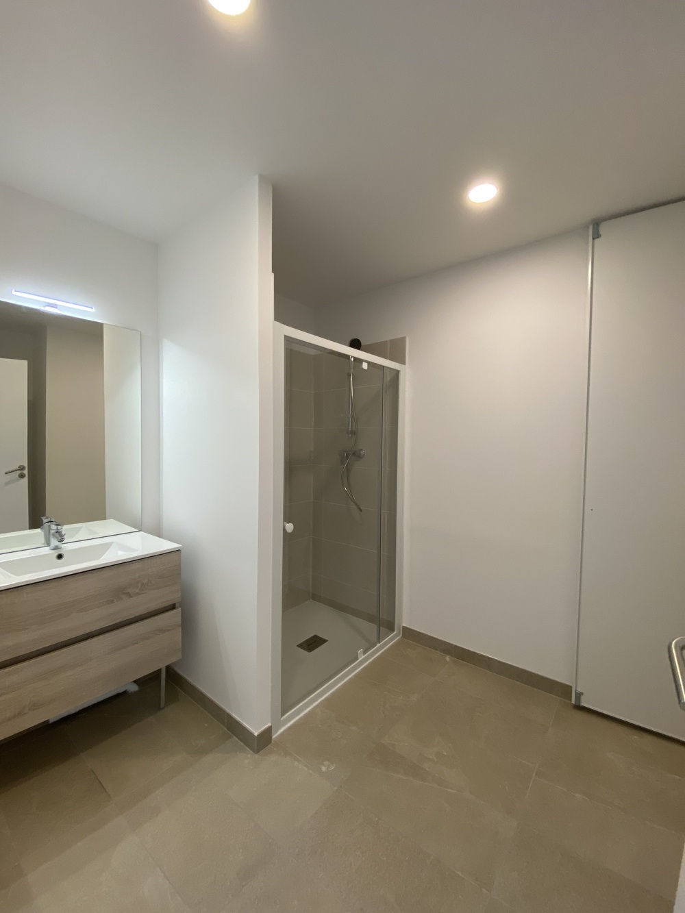 au RDC, un 2 pièces de 49.7m² comprenant, une pièce principale avec une cuisine aménagée et équipée, une chambre, une salle d'eau avec wc.