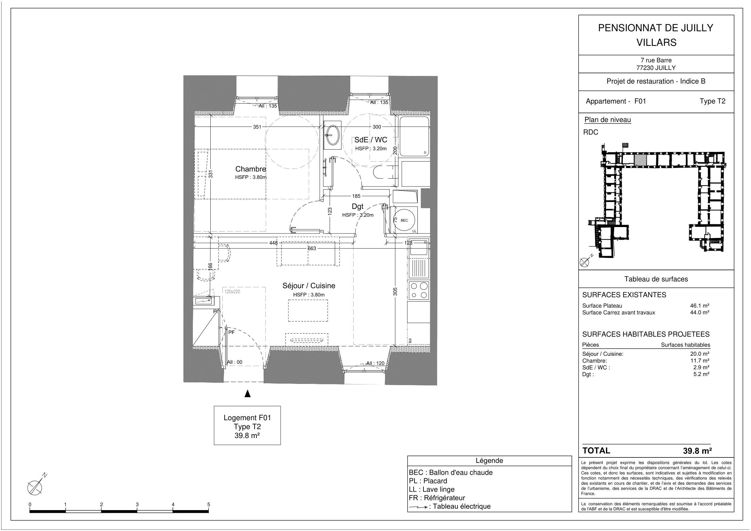Au RDC, un 2 pièces de 39.8m² comprenant, un séjour avec une cuisine aménagée et équipée, une chambre, une salle d'eau avec wc.