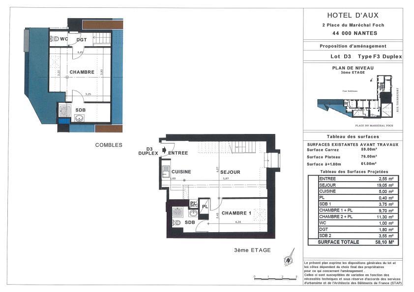 NANTES CENTRE - Quartier Cathédrale - Résidence Hôtel d'Aux (D3) : magnifique T3 en duplex avec de beaux volumes et hauteur sous plafond. Il comprend une pièce de vie principale avec cuisine ouverte sur le séjour, 2 salles d'eau ainsi que 2 WC.