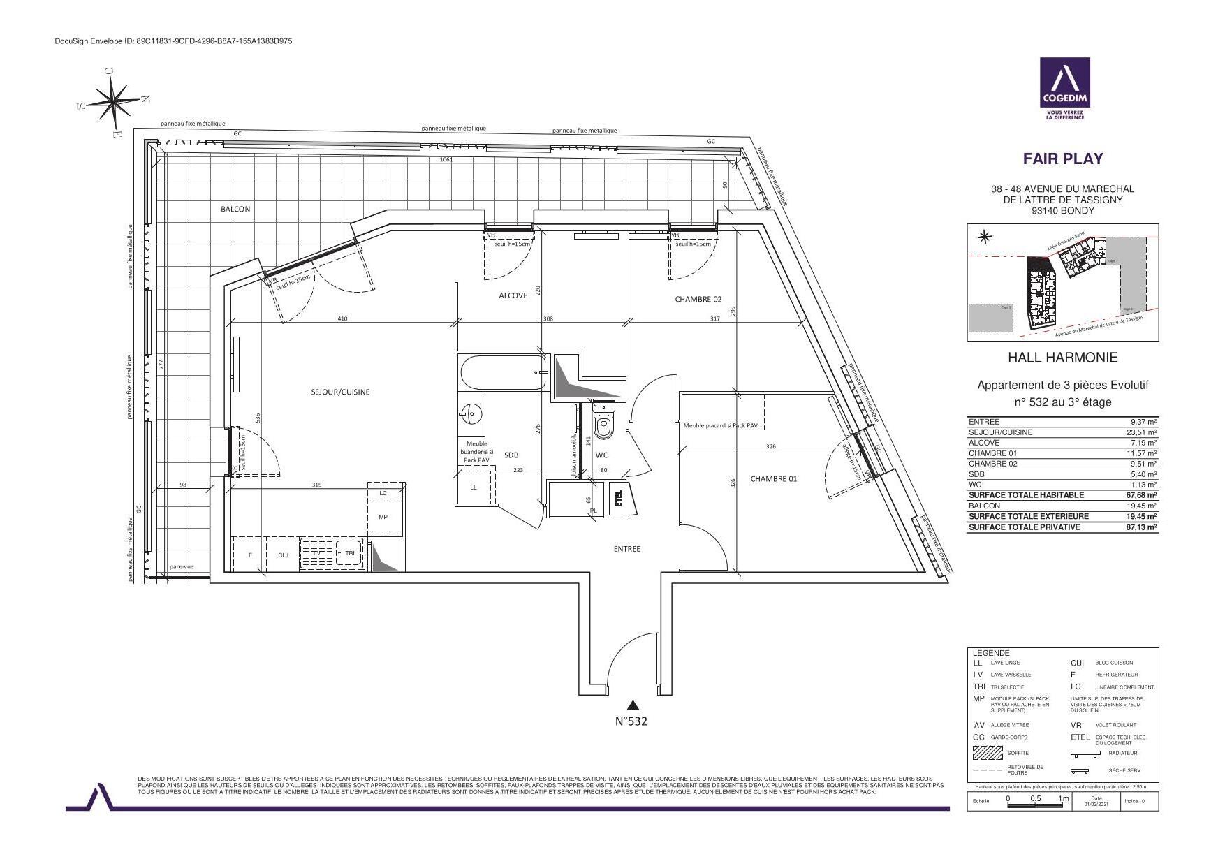 Un appartement de type T3+Alcove (532) d'une surface de 67,68m2 au 3ème étage avec ascenseur.