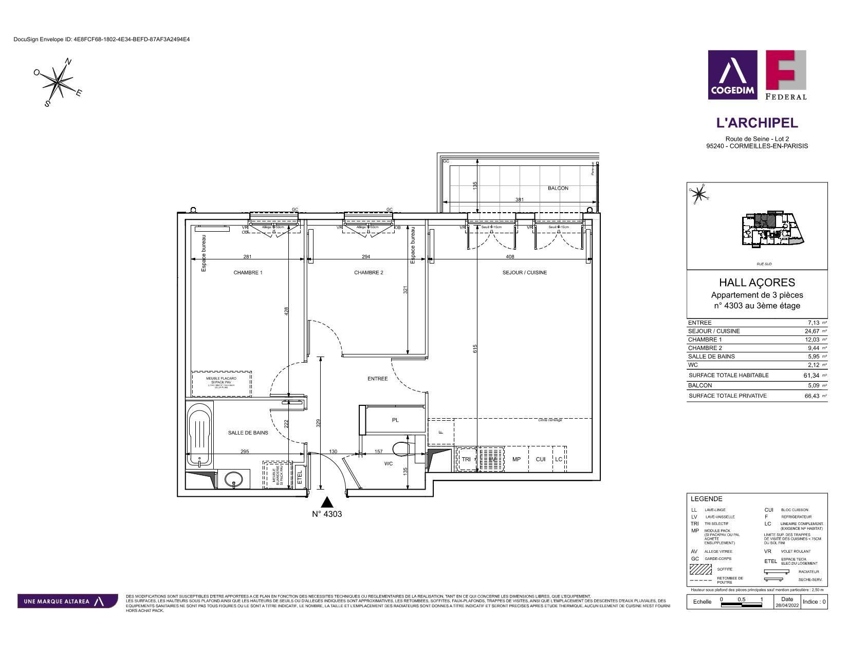 Un appartement de type T3 (4303) d'une surface de 61,34m2 situé au 3éme étage avec ascenseur.