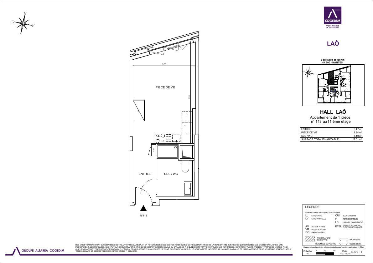 BEAU T1 de 27.51m² au 11e étage d'une résidence récente de 17 étages avec ascenseur comprenant une cuisine aménagée ouverte sur la pièce de vie, 1 salle d'eau et des WC.