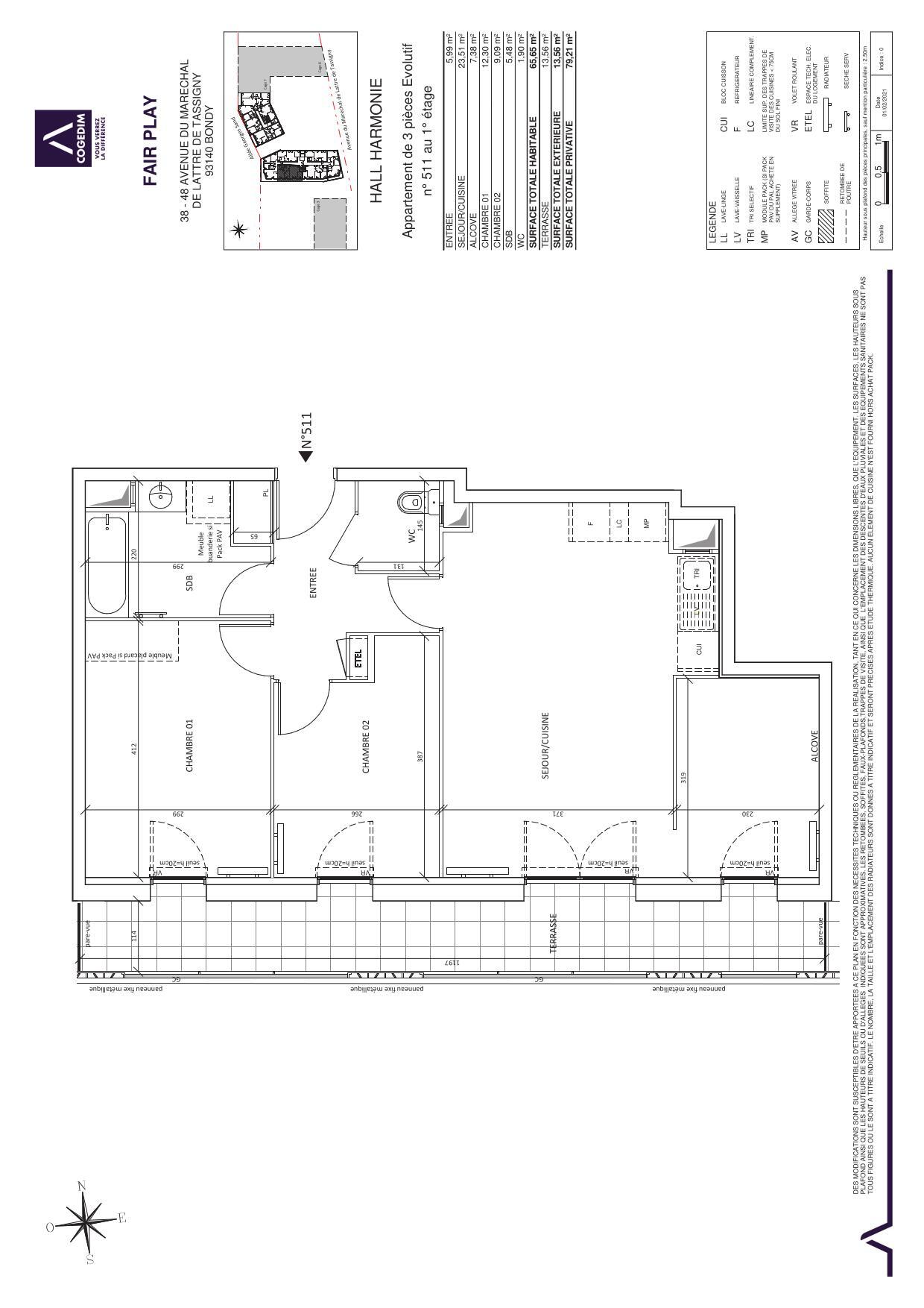 Un appartement de type T3 (511) d'une surface de 65,65m2 au 1er étage avec ascenseur.