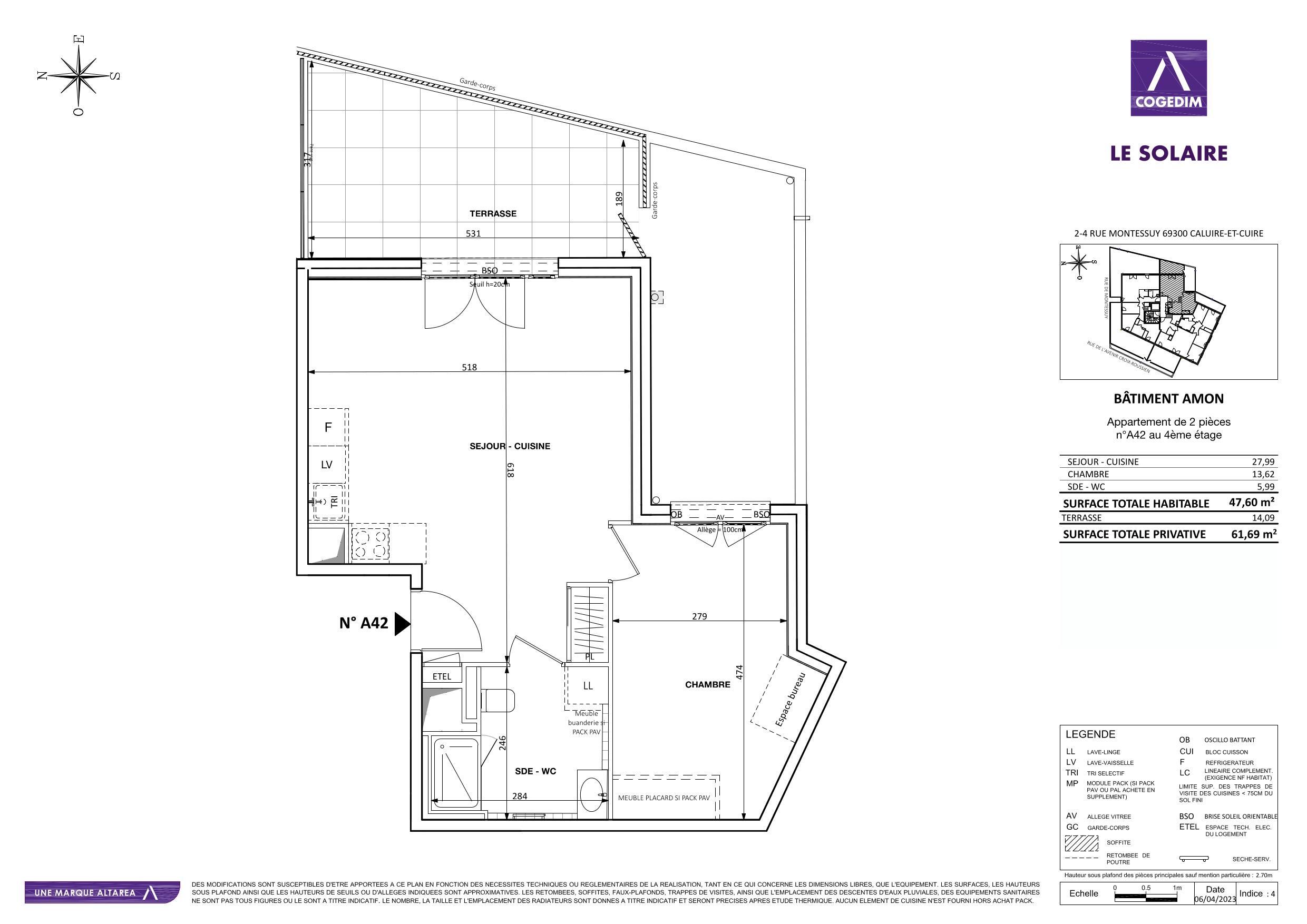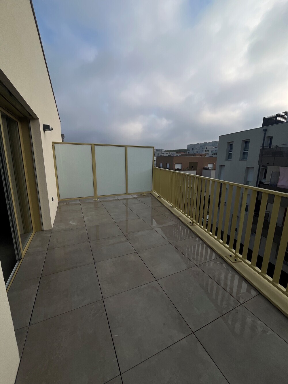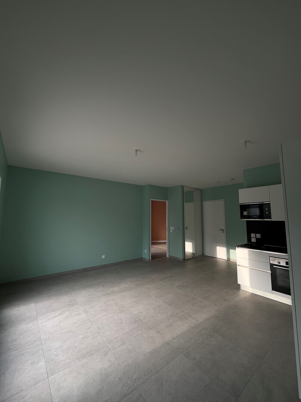 Appartement neuf de type T2, de 47,60m² situé au 4ème étage, exposé Est, composé d'un séjour cuisine de 27,99 m², avec une cuisine meublée et équipée d'une plaque de cuisson, d'une hotte aspirante, d'un four, d'un micro-ondes, d'un réfrigérateur et d'un lave-vaisselle, d'une chambre de 13,62m², d'une salle d'eau avec WC de 5,99m² équipée d'un lave linge et d'une terrasse privative de 14, 09m². Un garage en sous-sol vient compléter cette offre.
