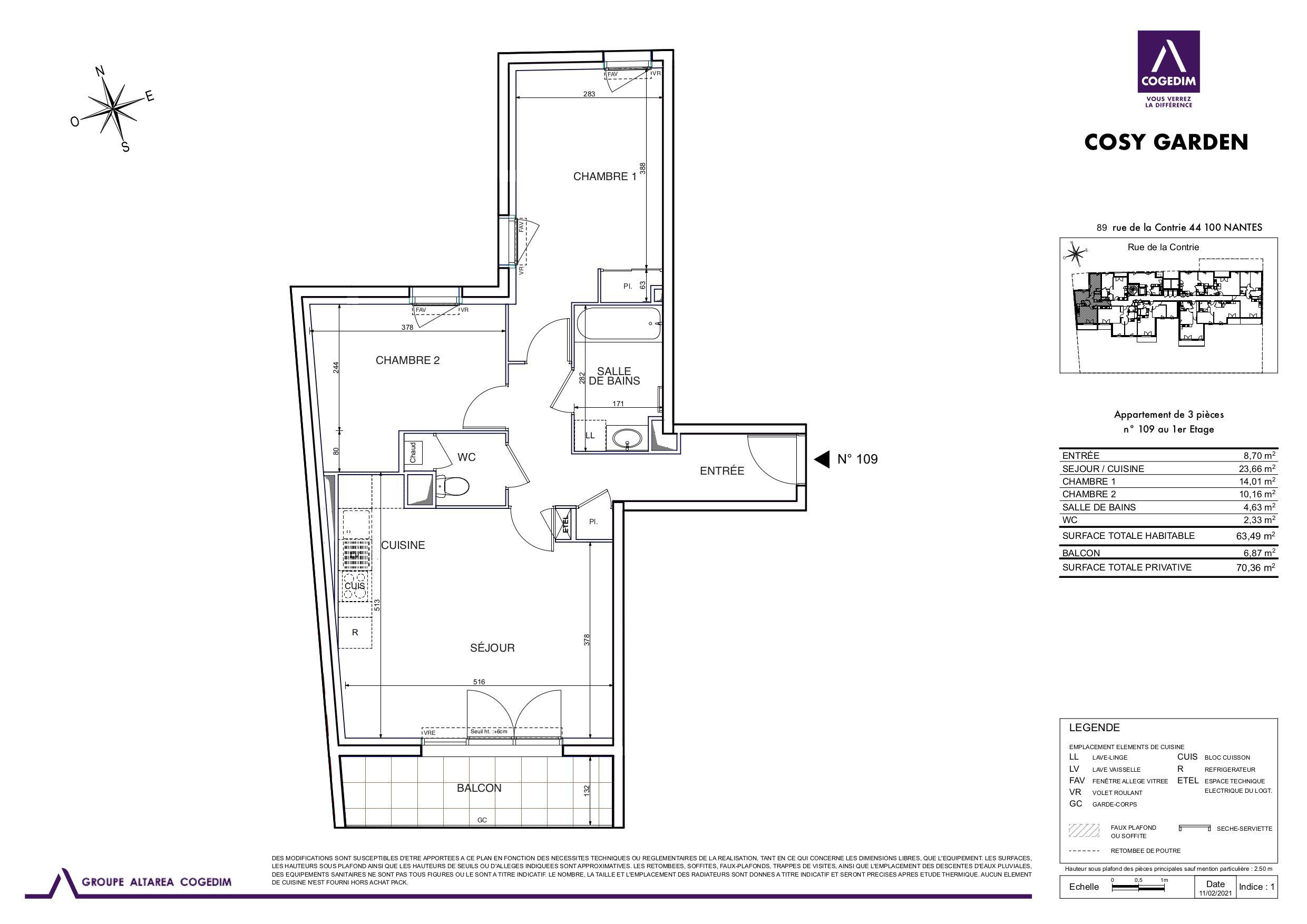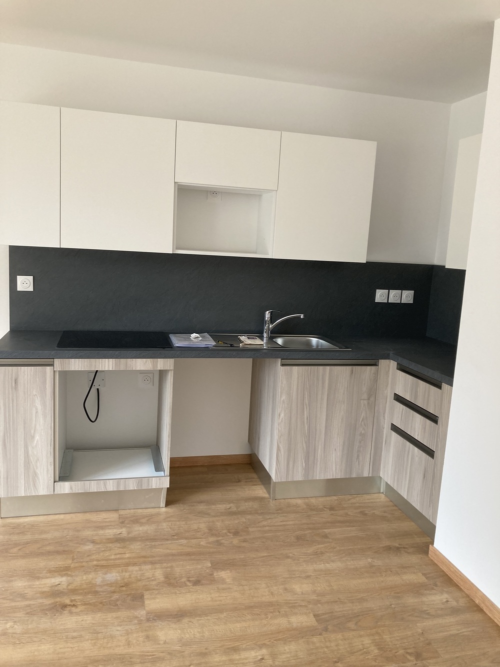 Agréable T3 de 63.49m² au premier étage d'une résidence récente avec ascenseur comprenant une entrée avec placard, une cuisine équipée ouverte sur la pièce de vie, 2 chambres dont une avec placard, 1 salle de bain et des WC séparés.